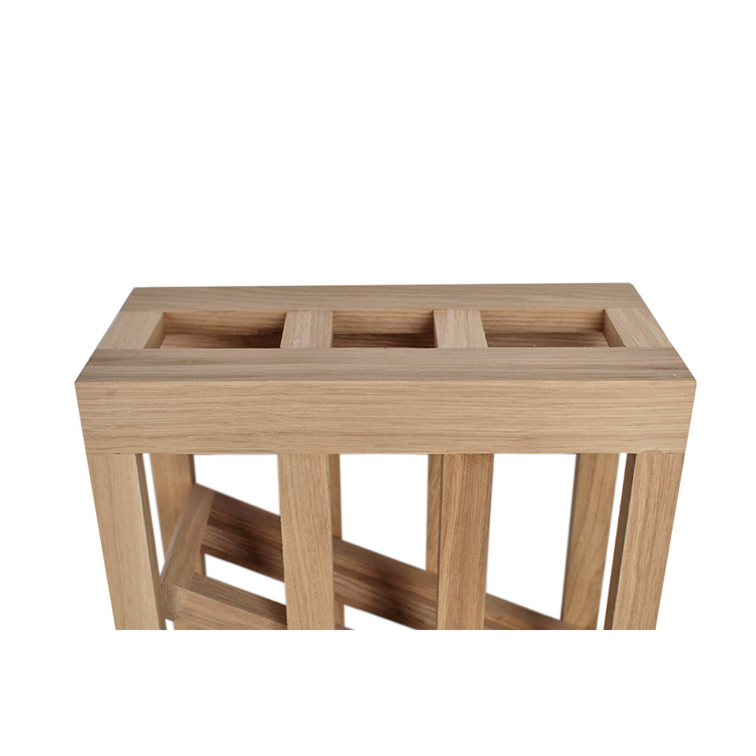 Dit wijnrek is vervaardigd uit hoogwaardig massief eikenhout, met zorg en aandacht voor detail, zoals de zorgvuldige afwerking van de buitenhoeken.