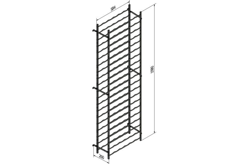 Een basisrek bestaat uit vier staanders, een aantal leggers en muursteunen. De leggers bieden ruimte voor de flessen, terwijl de muursteunen zorgen voor extra stabiliteit. Deze steunen moeten aan de muur worden bevestigd om te voorkomen dat het rek gaat wiebelen of omvalt. Indien boren in de muur niet mogelijk is, kunt u houten of kunststof latten aan de muur verlijmen en daaraan de rekken vastschroeven. Dit biedt een stevige en veilige oplossing, zonder schade aan de muur te veroorzaken.