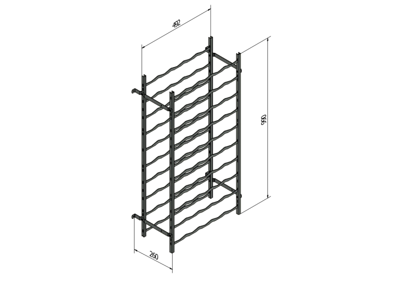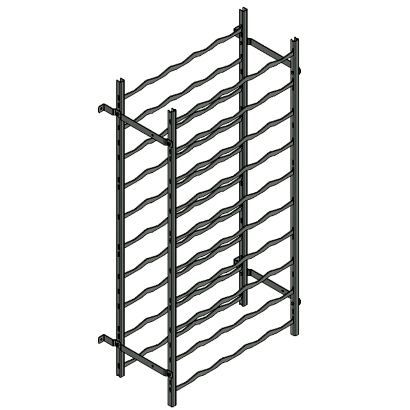 Een basisrek bestaat uit vier staanders, een aantal leggers en muursteunen. De leggers bieden ruimte voor de flessen, terwijl de muursteunen zorgen voor extra stabiliteit. Deze steunen moeten aan de muur worden bevestigd om te voorkomen dat het rek gaat wiebelen of omvalt. Indien boren in de muur niet mogelijk is, kunt u houten of kunststof latten aan de muur verlijmen en daaraan de rekken vastschroeven. Dit biedt een stevige en veilige oplossing, zonder schade aan de muur te veroorzaken.