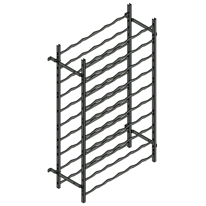 Een basisrek bestaat uit vier staanders, een aantal leggers en muursteunen. De leggers bieden ruimte voor de flessen, terwijl de muursteunen zorgen voor extra stabiliteit. Deze steunen moeten aan de muur worden bevestigd om te voorkomen dat het rek gaat wiebelen of omvalt. Indien boren in de muur niet mogelijk is, kunt u houten of kunststof latten aan de muur verlijmen en daaraan de rekken vastschroeven. Dit biedt een stevige en veilige oplossing, zonder schade aan de muur te veroorzaken.