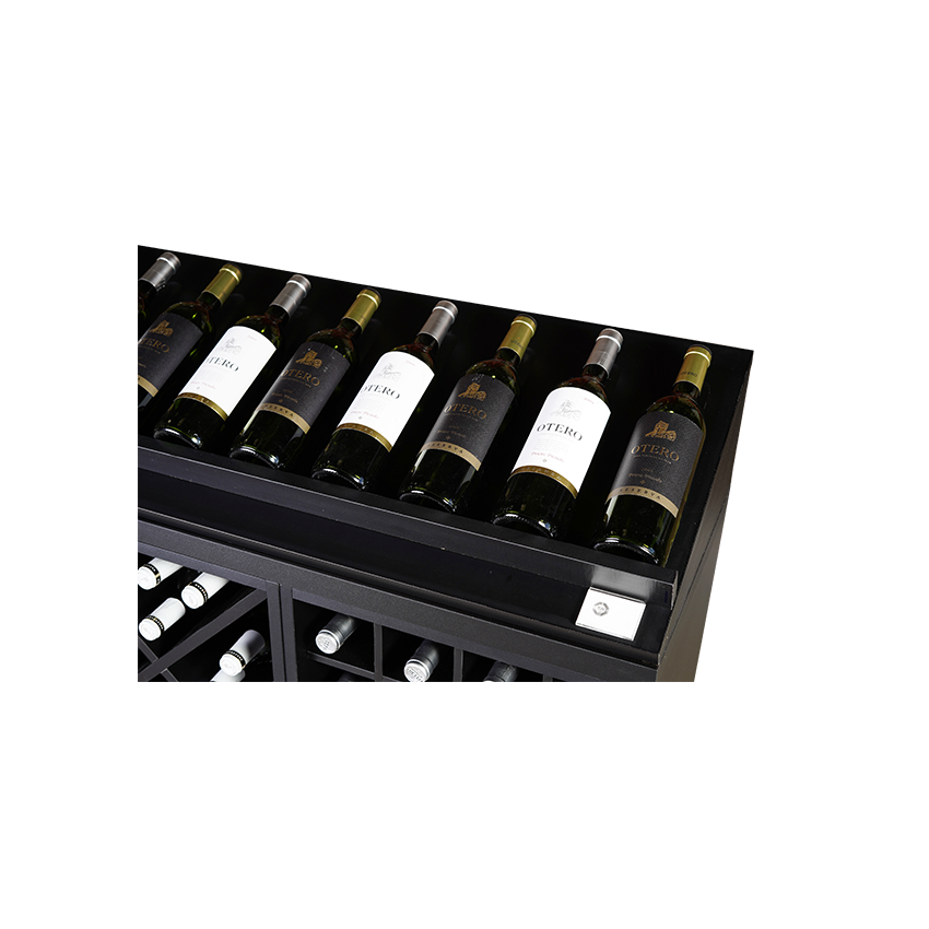 De Nero-652043 biedt plaats aan maximaal 144 flessen en is vervaardigd uit houtcomposiet met een elegante matzwarte melaminelaag met subtiele structuur.