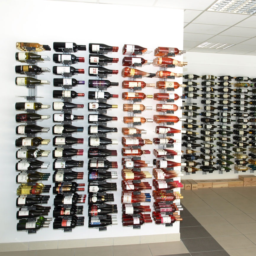 Bij de Plus-variant liggen de drie flessen naast elkaar, haaks aan de muur voor een overzichtelijke collectie.