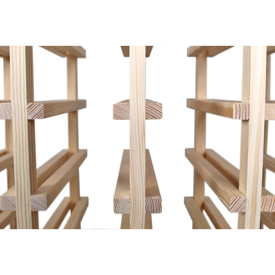 Dit wijnrek is vervaardigd uit massief grenenhout, met zorg en aandacht voor detail, zoals de zorgvuldige afwerking van de buitenhoeken.